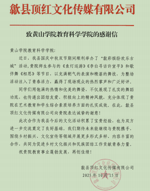 国庆中秋双节期间,在歙县“彩缤纷欢乐古城”活动现场,学前教育专业的学子参演了《鱼灯巡游》《李白寻访许宣平》及歌伴舞《相思》等节目,以灵动的舞姿和饱满的热情点燃了现场氛围,赢得了观众的一致好评。活动结束后,歙县顶红文化传媒有限公司专门致信,高度肯定该专业在学生综合素质培养上的显著成效,并表达了深化合作的期待。
