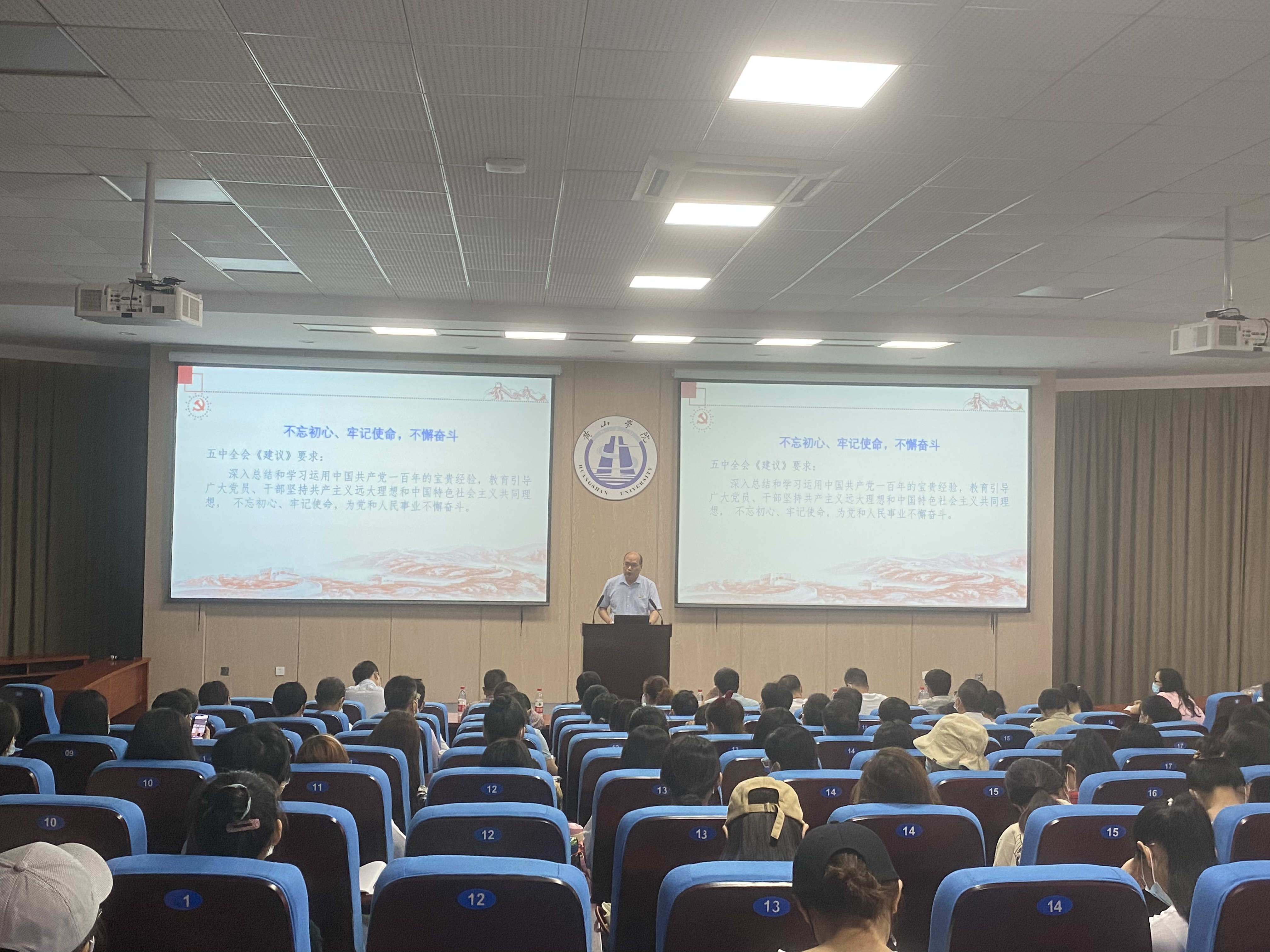 刘芳正老师从实事求是,正本清源:科学认识百年党史;百年征程蕴含的宝贵经验以及扎根红色徽州,办人民满意教育等三个方面,由浅入深,由理论到实践论证了中国共产党的百年征程,帮助大家树立正确的党史观,认识徽州红色资源和发挥铁军精神、黄山松精神重要意义,并结合教师职业提出党史学习教育的重要启示。
