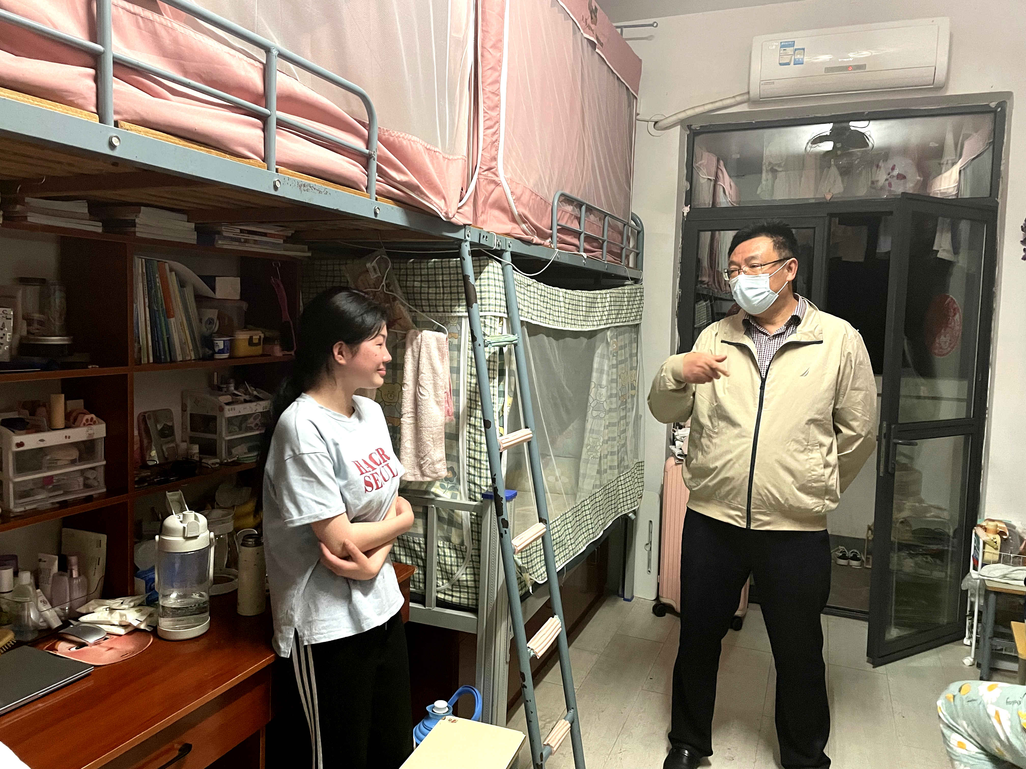 每到一间宿舍,徐俊华便与同学们进行亲切的交谈,向同学们传达了当前疫情防控政策,了解线上教学效果以及当前的学习生活需求;叮嘱同学们要时刻关注疫情变化,出入公共场所规范佩戴口罩;按时完成健康打卡,如有身体不适,一定要及时上报;遵守学校疫情防控要求,积极配合学校疫情防控工作,主动进行核酸检测,落实防控措施;线上教学期间,要认真学习,不要有懈怠心理。同时对同学们疫情期间的线上学习生活提出了一系列的建议,希望同学们在疫情封校管理期间保证身心健康,保持积极向上的状态,认真学习,充实度过疫情防控期间的校园文化生活。辅导员老师也叮嘱大家疫情防控期间要注意寝室环境卫生,养成良好的生活习惯,注意用电安全,合理规划学习和生活。