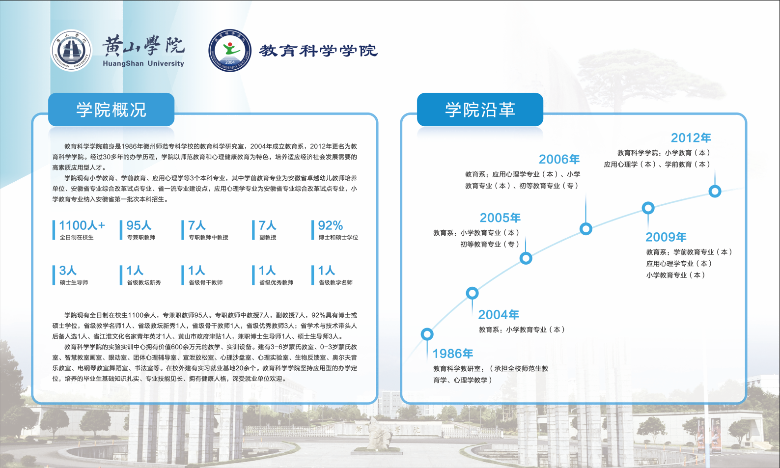 太阳成集团tyc7111前身是1986年徽州师范专科学校的教育科学研究室,2004年成立教育系,2012年更名为太阳成集团tyc7111。现有小学教育、学前教育、应用心理学等3个专业,其中小学教育为省传统专业改造提升专业、省第一批次本科招生;应用心理学为省专业综合改革试点专业、省大学生心理健康实践教育基地、省示范基层教研室、省示范实验实训中心、省教学创新团队和省传统专业改造提升专业;学前教育为省卓越幼儿教师培养创新示范区立项单位、省专业综合改革试点专业、省一流专业建设点和省级教学创新团队。