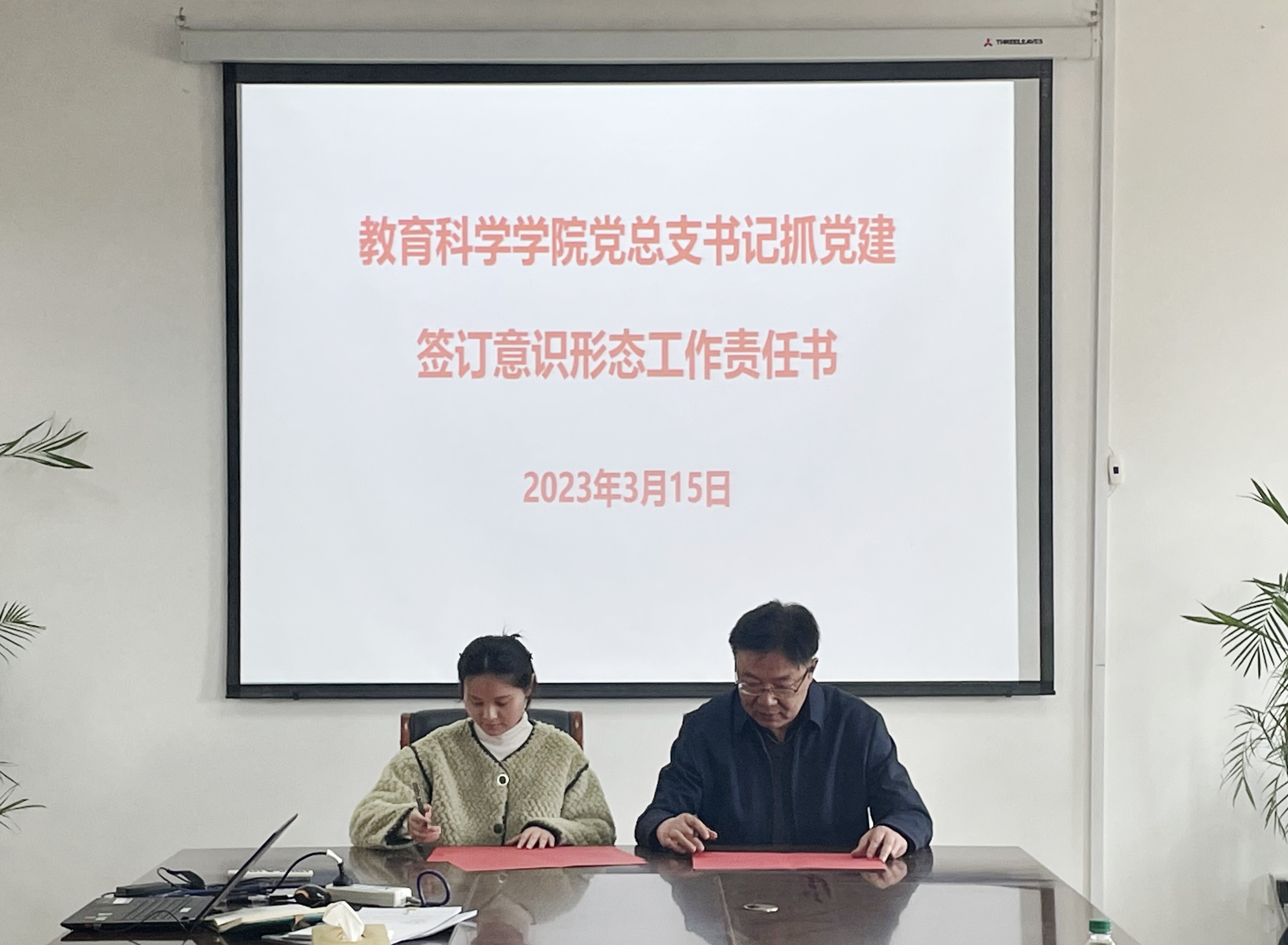 徐俊华传达了学校2023年全面从严治党工作会议精神,带领大家系统学习了习近平总书记关于意识形态工作的系列重要讲话和《tyc7111cc太阳成集团意识形态工作责任书》的内容,并分别与党支部书记、教研室主任签订了意识形态工作责任书。