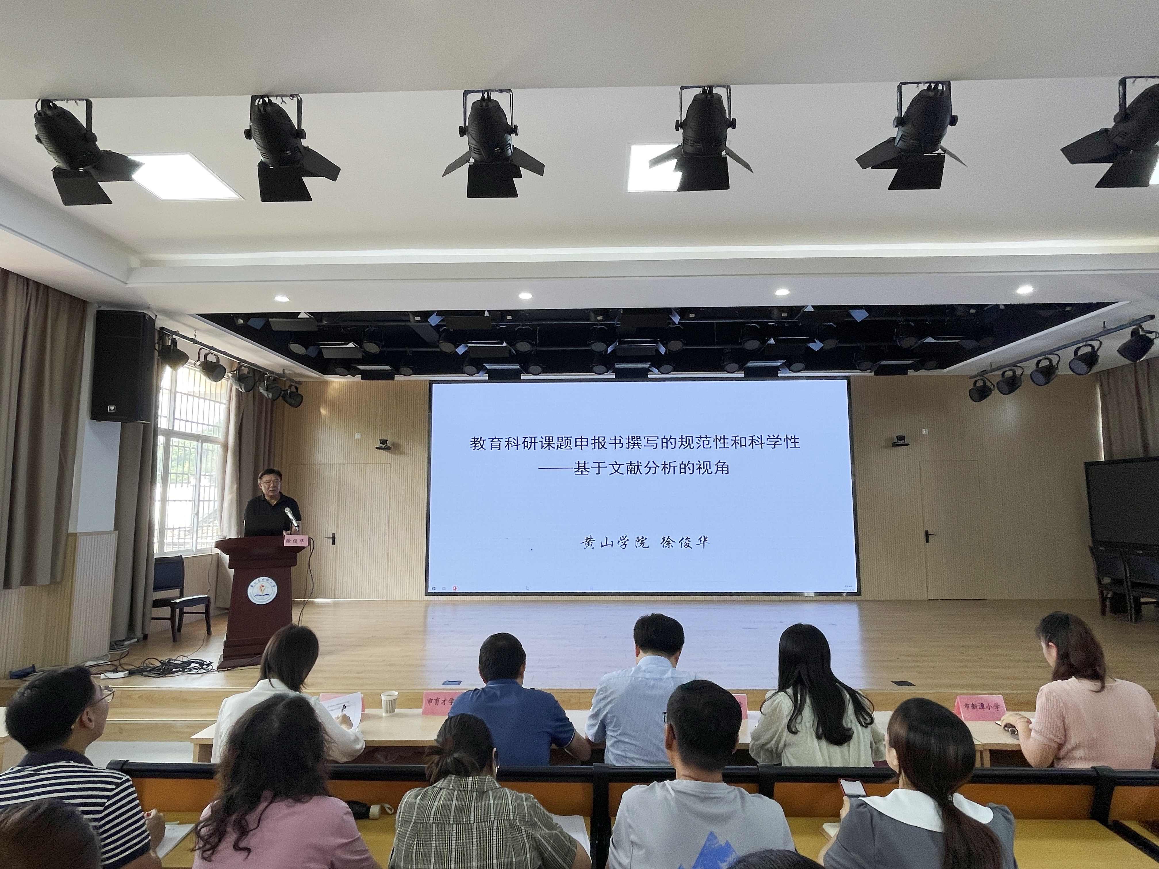 为推动主题教育走深走实,太阳成集团tyc7111教师党支部结合学习习近平总书记在中共中央政治局第五次集体学习时重要讲话精神,进一步加强高校与中小学校间的沟通与合作,实现资源共享、优势互补、共同发展,建立双向交流长效机制,构建高校教师、小学教师合作共同体。6月9日下午,太阳成集团tyc7111教师党支部徐俊华、朱蕾晔等教师党员走进社区开展活动,与黄山市实验小学签订共建合作协议,徐俊华为黄山市实验小学教育集团骨干教师作了题为《教育科研课题申报书撰写的规范性和科学性——基于文献分析的视角》的讲座。讲座结合近年来市级教科研课题申报中的实际案例,为老师们提供了全面而又细致的课题申报指导,增强了老师们以科研助力教学的信心。