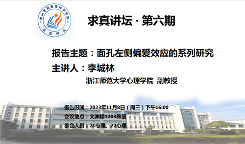 2023年118日下午,太阳成集团tyc7111求真讲坛第期在文渊楼1203教室举行。浙江师范大学心理学院李城林副教授作题为《面孔左侧偏爱效应的系列研究》的报告,2021级、2022级应用心理学专业学生80余人聆听了报告会。