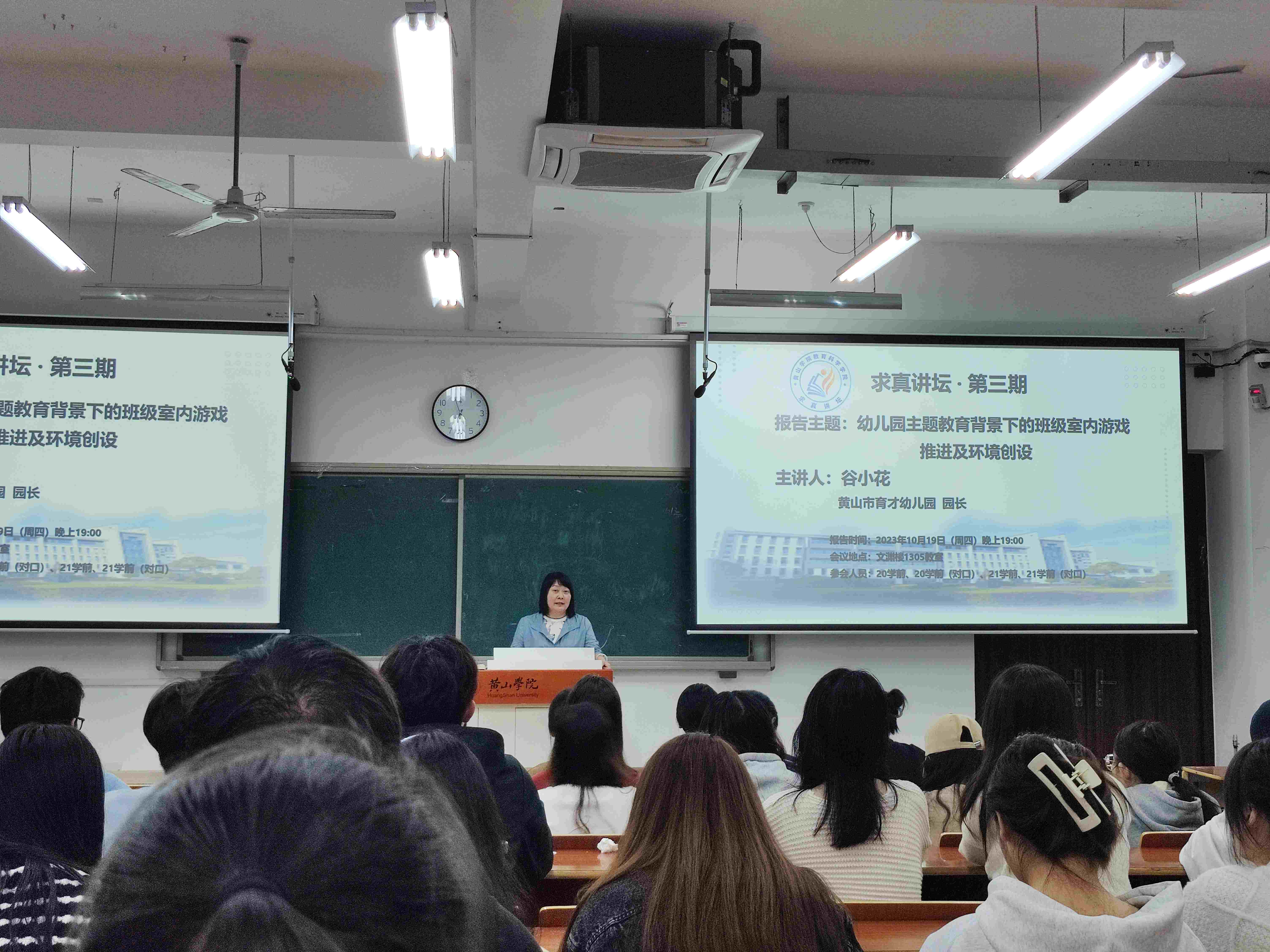 10月19日晚上7点,太阳成集团tyc7111“求真讲坛”第三期报告会在文渊楼1305教室举行。黄山市育才幼儿园园长谷小花作题为《幼儿园主题教育背景下的班级室内游戏推进及环境创设》的报告。20学前教育和21学前教育学生聆听了报告会。