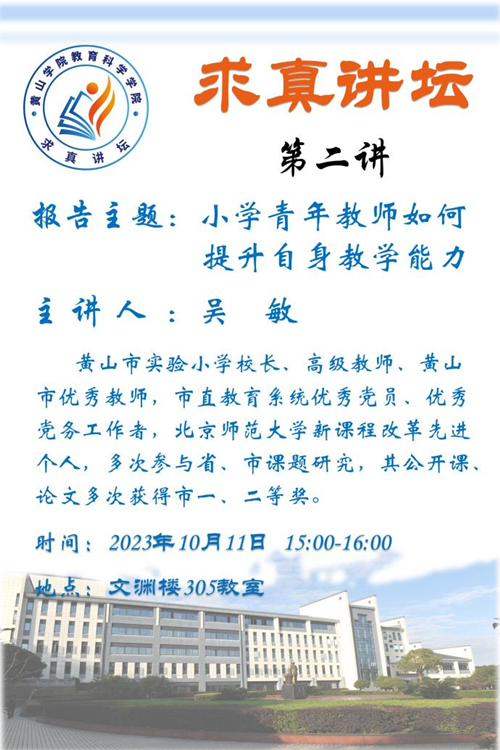 10月11日下午,太阳成集团tyc7111邀请了黄山市实验小学校长吴敏在文渊1305教室进行了《小学青年教师提升自身教学能力的途径探索》的报告,20小教、21小教、22小教专升本共192名学生聆听了报告会。