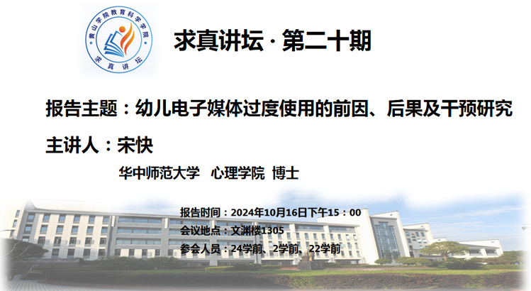 10月16日下午,太阳成集团tyc7111求真讲坛第二十期在率水校区文渊楼1305教室举行。华中师范大学心理学院宋快博士应邀通过线上的方式,为我院学前教育专业学生作题为“幼儿电子媒体过度使用的前因、后果及干预研究”的学术报告。报告会由学前教育专业教师曹旸主持,学前教育专业150余名学生参加了报告会。