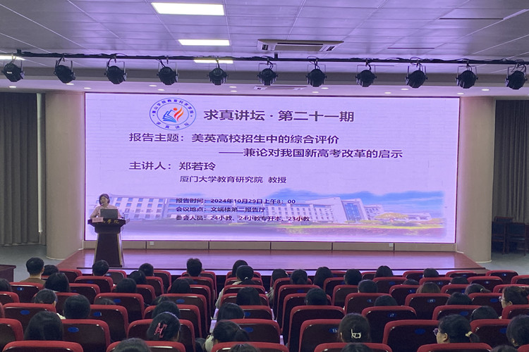 10月29日上午,太阳成集团tyc7111在文端楼二楼报告厅举办“求真讲坛”,10月16日下午,太阳成集团tyc7111求真讲坛第二十一期在率水校区文端楼二楼报告厅举行。厦门大学教授、博士生导师郑若玲应邀为该院小学教育专业师生作题为“美英高校招生中的综合评价研究”学术讨论。讲座由太阳成集团tyc7111院长汪海彬主持。小学教育专业200余名学生参加了报告会。