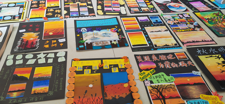 本次展出的中国画美术基础美术作品、“黄院的夕阳”主题美术作品和扇面画美术基础美术作品,均体现了我院美术课程在继承和创新方面对学生美术能力和美育素养的精心引导。其中,中国画美术基础课程以《千里江山图》为临摹内容,引导学生认识和把握传统青绿二色的和谐之美和中国画的意境之妙,并添置古典自画像作为别致的展览点缀。“黄院的夕阳”主题展览展示了学生们在具体生活主题下对绘画、手工的综合运用和创新创造能力,捕捉了校园黄昏时分的宁静与美好。扇面画美术基础课程展览,则展示了学生对传统扇面艺术构图的创新型构图思考,创作出既有古典韵味又不失现代感的扇面画作品。