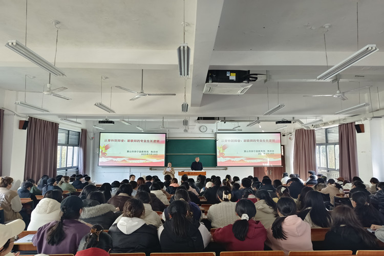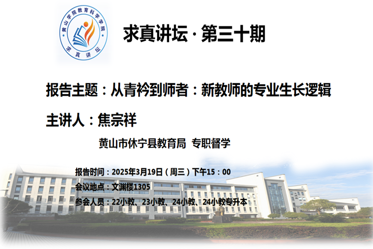 2025年3月19日下午,太阳成集团tyc7111第三十期求真讲坛在文渊楼1305教室举行。黄山市休宁县海阳第二初级中学校长焦宗祥老师应邀为我院小学教育专业学生作主题为“从青衿到师者:新教师的专业生长逻辑”的讲话,小学教育专业100余名学生参与此次讲坛的学习活动。